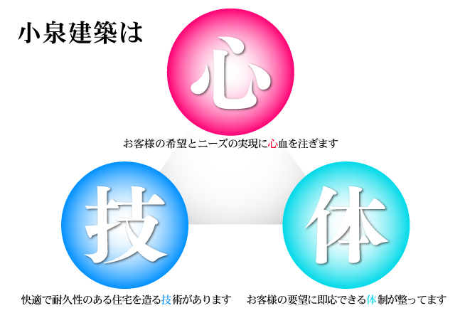 日本のように温度変化が大きく、湿度が高い気候風土で耐久性に優れ尚且つ、人に優しい構造は木造住宅ですが、小泉建築では左記にあるようなさまざまな工法で、お客様のニーズにお応えしております。